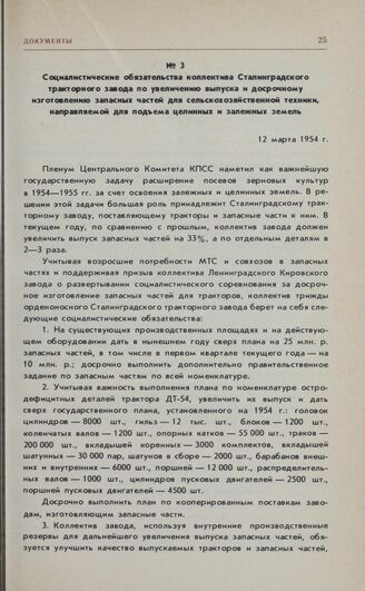 Социалистические обязательства коллектива Сталинградского тракторного завода по увеличению выпуска и досрочному изготовлению запасных частей для сельскохозяйственной техники, направляемой для подъема целинных и залежных земель. 12 марта 1954 г. // «Сталинградская правда», 1954, 12 марта.