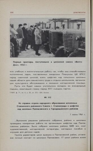 Из справки отдела народного образования исполкома Сталинского районного Совета г. Сталинграда о шефстве над школами Палласовского и Городищенского районов. 1 июня 1961 г. // ГАВО, ф. 6682, оп. 1, д. 189, лл. 177—178. Подлинник.