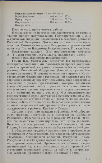 Заседание Государственной Думы. 11 февраля 1994 г. О проекте постановления Государственной Думы о кризисной ситуации, сложившейся в северных регионах Российской Федерации. Доклад заместителя председателя Комитета Государственной Думы по делам Федерации и региональной политике Гомана В.В.