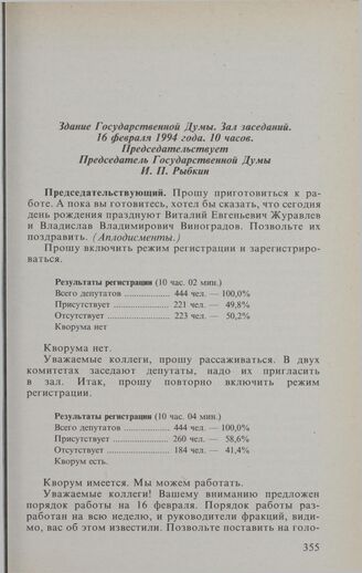 Заседание Государственной Думы. 16 февраля 1994 г. Обсуждение и принятие повестки дня заседания