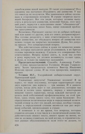 Заседание Государственной Думы. 16 февраля 1994 г. О проекте постановления Государственной Думы об амнистии в связи с принятием Конституции Российской Федерации. Продолжение выступлений в прениях. Устинов И.Г.
