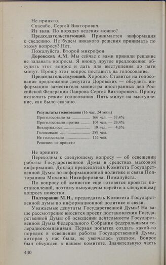 Заседание Государственной Думы. 16 февраля 1994 г. Об освещении работы Государственной Думы в средствах массовой информации. Доклад председателя Комитета Государственной Думы по информационной политике и связи Полторанина М.Н.