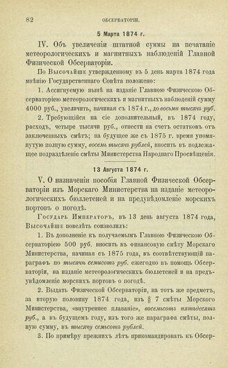 Постановления по обсерваториям, состоящим в ведении Академии Наук. Об увеличении штатной суммы на печатание метеорологических и магнитных наблюдений Главной Физической Обсерватории. 5 Марта 1874 г.