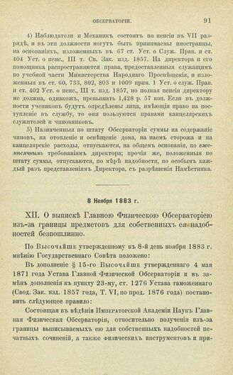 Постановления по обсерваториям, состоящим в ведении Академии Наук. О выписке Главною Физическою Обсерваториею из-за границы предметов для собственных ее надобностей беспошлинно. 8 Ноября 1883 г.