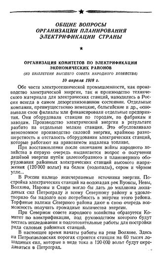 Организация комитетов по электрификации экономических районов. (Из бюллетеня Высшего совета народного хозяйства). 10 апреля 1918 г.
