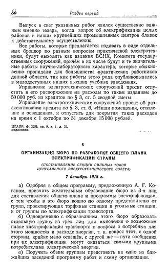 Организация бюро по разработке общего плана электрификации страны. (Постановление секции сильных токов Центрального электротехнического совета). 7 декабря 1918 г. // ЦГАОР, ф. 2263, оп. 1, д, 73, л. 64, копия.