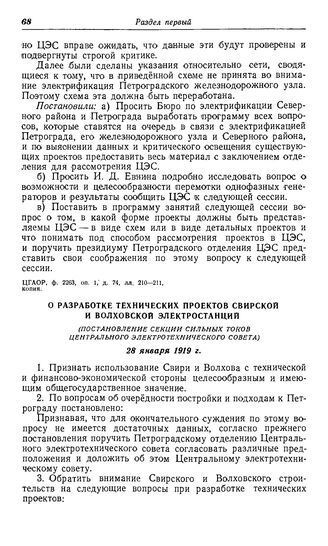 О разработке технических проектов Свирской и Волховской электростанций. (Постановление секции сильных токов Центрального электротехнического совета). 28 января 1919 г. // ЦГАОР, ф. 2263, оп. 2, д. 93, л. 16, подлинник.