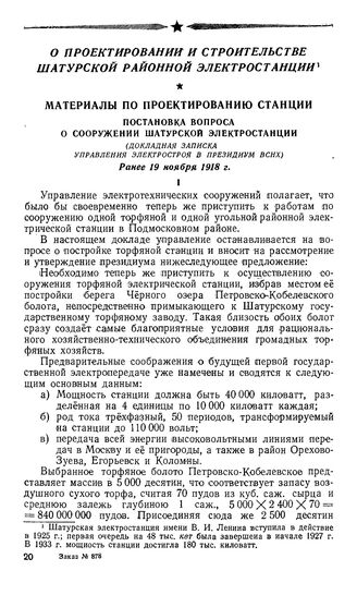 О проектировании и строительстве Шатурской районной электростанции. Постановка вопроса о сооружении Шатурской электростанции. (Докладная записка Управления Электростроя в президиум ВСНХ). Ранее 19 ноября 1918 г. // ЦГАОР, ф. 2259, оп. 9, д. 1, лл. 114—116, подлинник.