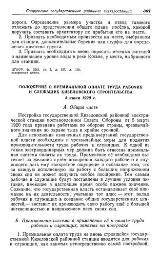 Приступ к строительству Кизеловской районной электростанции. Положение о премиальной оплате труда рабочих и служащих Кизеловского строительства. 8 июня 1920 г. // ЦГАОР, ф. 2263, оп. 3, д. 62, л. 3, копия.