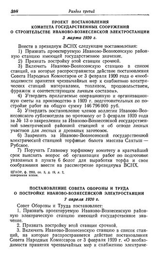 О проектировании Иваново-Вознесенской районной электростанции. Постановление Совета Обороны и Труда о постройке Иваново-Вознесенской электростанции. 7 апреля 1920 г. // ЦГАОР, ф. 130, оп. 4, д. 216, л. 19, заверенная копия.