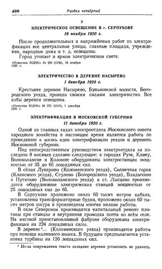 Строительство местных электростанций в Центральном промышленном районе. Московская губерния. Электрическое освещение в г. Серпухове. 18 ноября 1920 г. // «Известия ВЦИК» № 259 (1106), 18 ноября 1920 г.