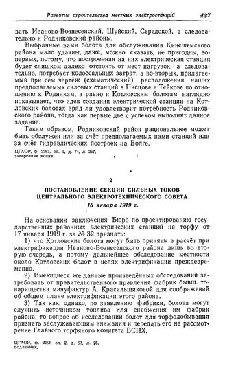 Строительство местных электростанций в Центральном промышленном районе. Иваново-Вознесенская губерния. Постановление секции сильных токов Центрального электротехнического совета. 18 января 1919 г. // ЦГАОР, ф. 2263, оп. 2, Д. 93, д, 25, подлинник.
