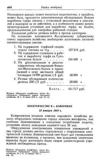 Строительство местных электростанций в Центральном промышленном районе. Костромская губерния. Электричество в г. Ковернине. 15 января 1919 г. // Журнал «Народное хозяйство», орган Костромского губернского совета народного хозяйства, № 1—2, 15 января 1919 г. стр. 27.