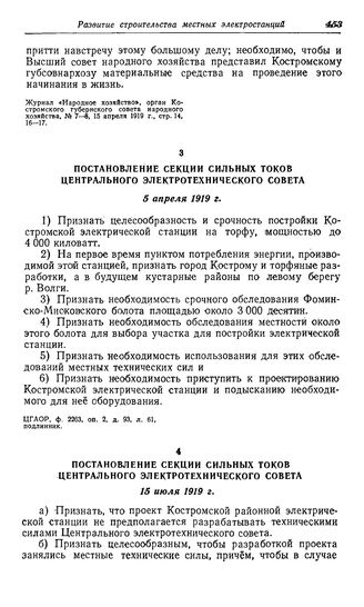 Строительство местных электростанций в Центральном промышленном районе. Костромская губерния. Постановление секции сильных токов Центрального электротехнического совета. 5 апреля 1919 г. // ЦГАОР, ф. 2263, оп. 2, д. 93, л. 61, подлинник.