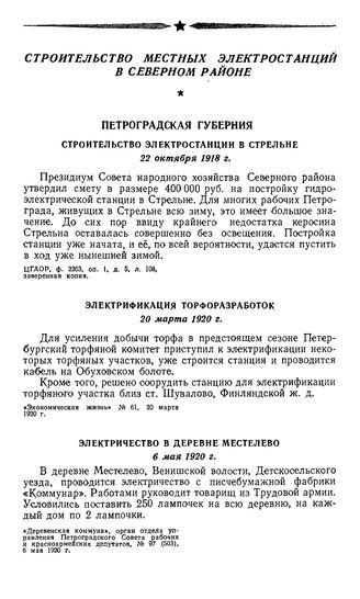 Строительство местных электростанций в Северном районе. Петроградская губерния. Строительство электростанции в Стрельне. 22 октября 1918 г. // ЦГАОР, ф. 2263, оп. 1, д. 5, л. 103, заверенная копия.