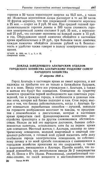 Строительство электростанций в Поволжье. Доклад заведующего Алатыроким отделом городского хозяйства Алатырскому уездному совету народного хозяйства.17 августа 1918 г. // ЦГАОР, ф. 2263, оп. 1, д. 5, л. 21, копия.