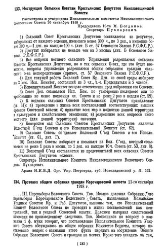 Инструкция Сельским Советам Крестьянских Депутатов Николаевщинской Волости Новоладожского у. Петроград. г. Рассмотрена и утверждена Исполнительным комитетом Николаевщинского Волостного Совета 30 сентября 1918 г. // Архив Н.К.В.Д. Орг. Упр. Петроград. губ. Новоладожский у. Л. 552.