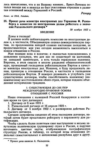 Проект речи министра иностранных дел Германии Ф. Розенберга в комиссии по иностранным делам рейхстага о значении Рапалльского договора. 30 ноября 1922 г.