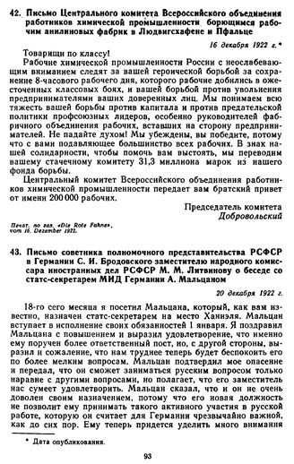 Письмо советника полномочного представительства РСФСР в Германии С.И. Бродовского заместителю народного комиссара иностранных дел РСФСР М.М. Литвинову о беседе со статс-секретарем МИД Германии А. Мальцаном. 20 декабря 1922 г. // Печат. по АВП СССР.