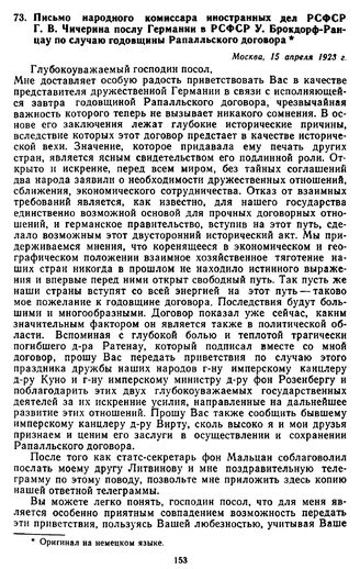 Письмо народного комиссара иностранных дел РСФСР Г.В. Чичерина послу Германии в РСФСР У. Брокдорф-Ранцау по случаю годовщины Рапалльского договора. 15 апреля 1923 г. // Печат. по ZStA, Potsdam.