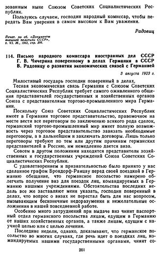 Письмо народного комиссара иностранных дел СССР Г.В. Чичерина поверенному в делах Германии в СССР В. Радовицу о развитии экономических связей с Германией. 3 августа 1923 г. // Печат. по АВП СССР.