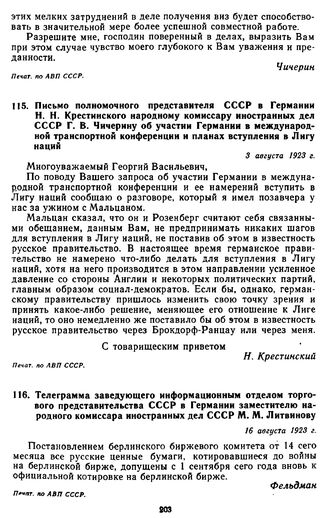 Телеграмма заведующего информационным отделом торгового представительства СССР в Германии заместителю народного комиссара иностранных дел СССР М.М. Литвинову. 16 августа 1923 г. // Печат. по АВП СССР.