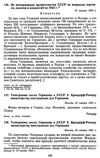 Телеграмма посла Германии в СССР У. Брокдорф-Ранцау министерству иностранных дел Германии. 22 января 1924 г. // Печат. по ZStA, Potsdam.