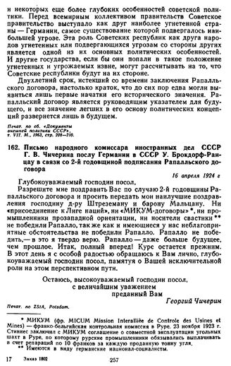 Письмо народного комиссара иностранных дел СССР Г.В. Чичерина послу Германии в СССР У. Брокдорф-Ранцау в связи со 2-й годовщиной подписания Рапалльского договора. 16 апреля 1924 г. // Печат. по ZStA, Potsdam.