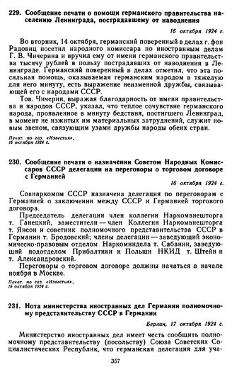 Сообщение печати о назначении Советом Народных Комиссаров СССР делегации на переговоры о торговом договоре с Германией. 16 октября 1924 г. // Печат. по газ. «Известия», 16 октября 1924 г.