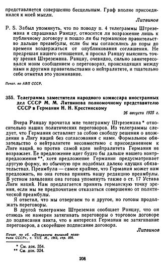 Телеграмма заместителя народного комиссара иностранных дел СССР М.М. Литвинова полномочному представителю СССР в Германии Н.Н. Крестинскому. 26 августа 1925 г. // Печат. по сб. «Документы внешней политики СССР», т. VIII. М., 1963, стр. 508.