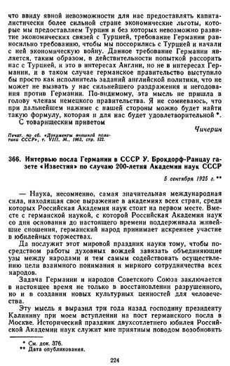 Интервью посла Германии в СССР У. Брокдорф-Ранцау газете «Известия» по случаю 200-летия Академии наук СССР. 5 сентября 1925 г.
