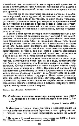 Сообщение народного комиссара иностранных дел СССР Г.В. Чичерина о беседе с рейхсканцлером Германии Г. Лютером. 2 октября 1925 г. // Печат. по сб. «Документы внешней политики СССР», т. VIII. М., 1963, стр. 558.