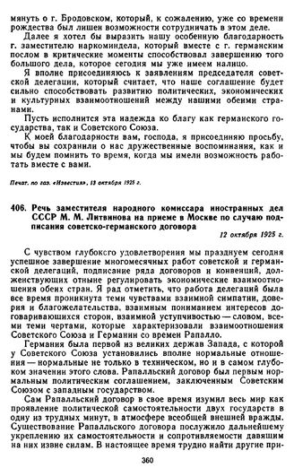 Речь заместителя народного комиссара иностранных дел СССР М.М. Литвинова на приеме в Москве по случаю подписания советско-германского договора. 12 октября 1925 г. // Печат. по газ. «Известия», 13 октября 1925 г.