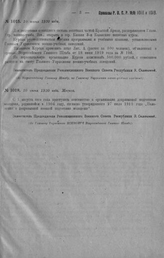 Приказ Революционного Военного Совета Республики № 1018. Об открытии в Казани 3-х Каз-х Пехотных курсов. 10 июня 1920 г. [По Всероссийскому Главному Штабу, по Главному Управлению военно-учебных заведений)