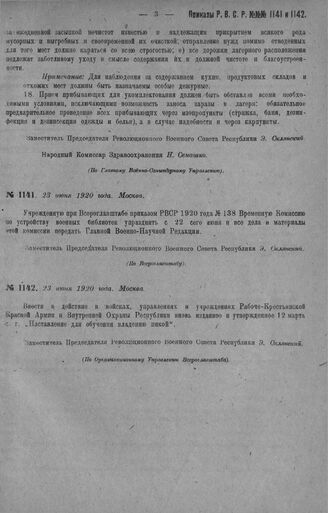 Приказ Революционного Военного Совета Республики № 1141. Об упразднении врем. Комиссии по устройству воен. библиотек с 22/VI -20 г. и о сдаче всех матер. и дел Главной В. Научной редакции. 23 июня 1920 г. (По Всероглавштабу)