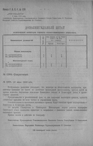 Приказ Революционного Военного Совета Республики № 1291. О немедленном проведении поголовной прививки во всех частях и учреждениях флота. 10 июля 1920 г. (По санитарной части флота)
