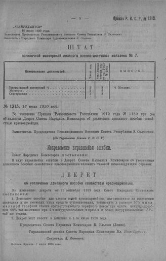 Приказ Революционного Военного Совета Республики № 1313. Об увеличении денежного пособия семействам красноармейцев (в изм. пр. 1130 — 1919 г.). 16 июля 1920 г. (По Управлению Делами Р.В.С.Р.)