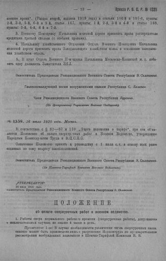 Приказ Революционного Военного Совета Республики № 1339. Об объявлении положения об оплате сверхурочных работ в воен. ведомстве. 16 июля 1920 г. (По Штатно-Тарифной Комиссии Военного Ведомства)