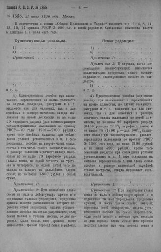 Приказ Революционного Военного Совета Республики № 1356. С новой редакцией п. п. 1, 4, 8, 11, 13, 15 и 17 приказа РВСР 1920 г. № 950 о порядке выдачи военнослужащим подъемных денег при перемещениях. 21 июля 1920 г. (По Штатно-Тарифной Комиссии Военного Ведомства)