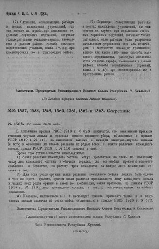 Приказ Революционного Военного Совета Республики № 1364. С пояснением приказа РВСР 1919 года № 116 и о порядке отпуска знаков различия командного состава в их присвоений. 21 июля 1920 г. (По ЦУСу)