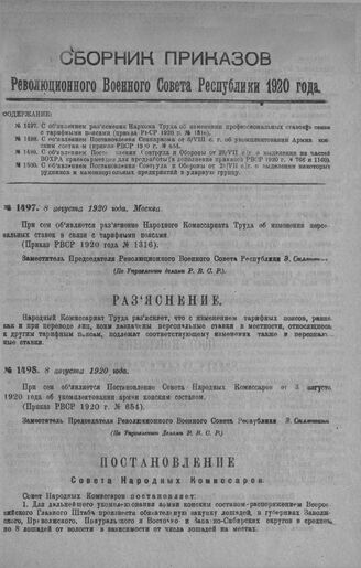 Приказ Революционного Военного Совета Республики № 1498. С объявлением Постановления Совнаркома от 8/VIII с. г. об укомплектовании Армии конским составом (приказ РВСР 1920 г. № 654). 8 августа 1920 г. (По Управлению делами Р.В.С.Р.)
