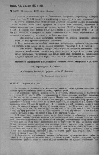 Приказ Революционного Военного Совета Республики № 1533. О противоцинготном питании команд Красного флота. 11 августа 1920 г. (По Санитарной части флота)
