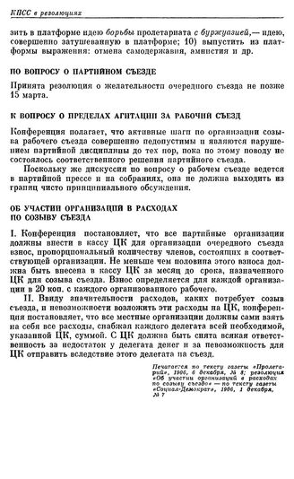 Вторая конференция РСДРП. («Первая Всероссийская»). Таммерфорс. 3 — 7 (16 — 20) ноября 1906 г. II. Резолюции конференции. К вопросу о пределах агитации за рабочий съезд // Печатается по тексту газеты «Пролетарий», 1906, 6 декабря, № 8; резолюция «Об участии организаций в расходах по созыву съезда» — по тексту газеты «Социал-Демократ», 1906, 1 декабря, № 7.