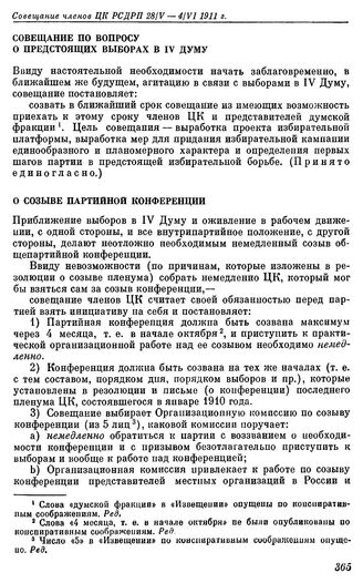 Совещание членов ЦК РСДРП. Париж, 28 мая — 4 июня (10 — 17 июня) 1911 г. II. Резолюции совещания. О созыве партийной конференции // Печатается по тексту отдельного листка, выпущенного совещанием членов ЦК в июне 1911 г., и по протоколам совещания, хранящимся в ЦПА ИМЛ, ф. 17, оп. 1, ч. III, д. 1035.