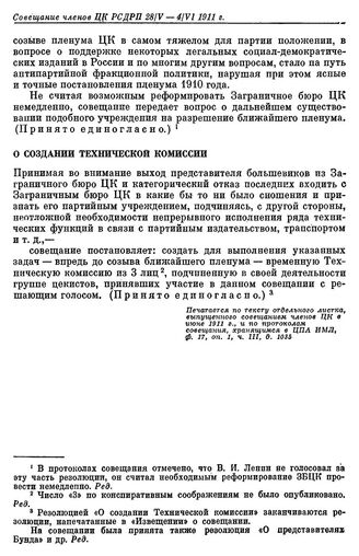 Совещание членов ЦК РСДРП. Париж, 28 мая — 4 июня (10 — 17 июня) 1911 г. II. Резолюции совещания. О создании Технической комиссии // Печатается по тексту отдельного листка, выпущенного совещанием членов ЦК в июне 1911 г., и по протоколам совещания, хранящимся в ЦПА ИМЛ, ф. 17, оп. 1, ч. III, д. 1035.