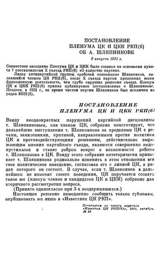 Постановление Пленума ЦК и ЦКК РКП(б) об А. Шляпникове. 9 августа 1921 г. // Печатается по тексту журнала «Известия ЦК РКП(б)», 1921, октябрь, № 33.