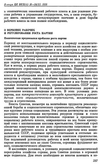 Пленум ЦК ВКП(б). Москва. 16—24 ноября 1928 г. Резолюции пленума. О вербовке рабочих и регулировании роста партии. Политические предпосылки проблемы роста партии