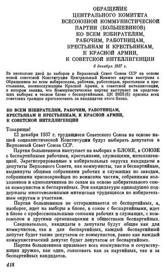 Обращение Центрального Комитета Всесоюзной коммунистической партии (большевиков) ко всем избирателям, рабочим, работницам, крестьянам и крестьянкам, к Красной Армии, к советской интеллигенции. 6 декабря 1937 г. // Печатается по тексту газеты «Правда», 1937, 7 декабря, № 335.