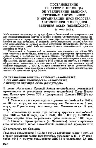Постановление СНК СССР и ЦК ВКП(б). Об увеличении выпуска грузовых автомобилей и организации производства автомобилей с передней ведущей осью (вездеходов). 24 июня 1941 г. // Печатается по тексту документа, хранящегося в ЦПА ИМЛ, ф. 17, оп. 69, д. 436, л. 5—12.