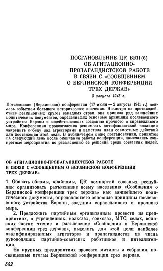 Постановление ЦК ВКП(б). Об агитационно-пропагандистской работе в связи с «Сообщением о Берлинской конференции трех держав». 3 августа 1945 г. // Печатается по тексту документа, хранящегося в ЦПА ИМЛ, ф. 17, оп. 59, д. 436, л. 165.
